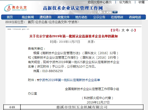 經(jīng)過2019年5到6月份地報國報網(wǎng)報紙報,7到9月份區(qū)縣科技局、國稅檢查與推薦,高新技術(shù)企業(yè)評審專家組進(jìn)行了現(xiàn)場審核,對高新技術(shù)企業(yè)的符合性、完整性、真實性、有效性進(jìn)行了審核檢查。對佳恒公司高新技術(shù)企業(yè)的研究與開發(fā)組織管理水平情況給予了充分肯定,并一致同意推薦至寧波高新技術(shù)企業(yè)評定工作委員會。經(jīng)寧波市評定委員會對公司高新技術(shù)管理體系相關(guān)工作進(jìn)行合規(guī)性審查、復(fù)合、公示后,公司一次性通過評審,圓滿完成高新技術(shù)企業(yè)認(rèn)定工作。